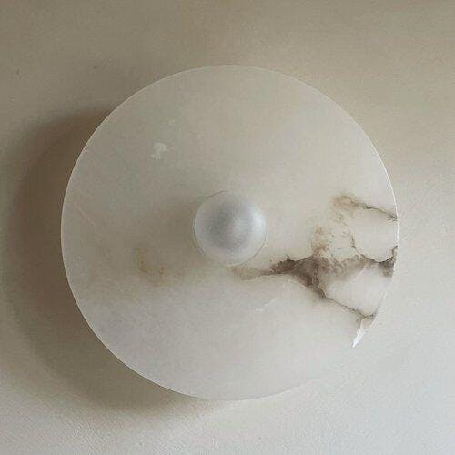 Elevate your indoor lighting with the Jagmag Lights Alba Alabaster Wall Lamp, a stunning blend of artistry and functionality. Crafted from premium Spanish snow gypsum, this wall lamp features a 28 cm diameter stone plate surrounded by an opaque optical lens, creating a mesmerizing harmonious halo effect when illuminated. Each piece is unique, as alabaster patterns vary from product to product, ensuring your lamp is one-of-a-kind.