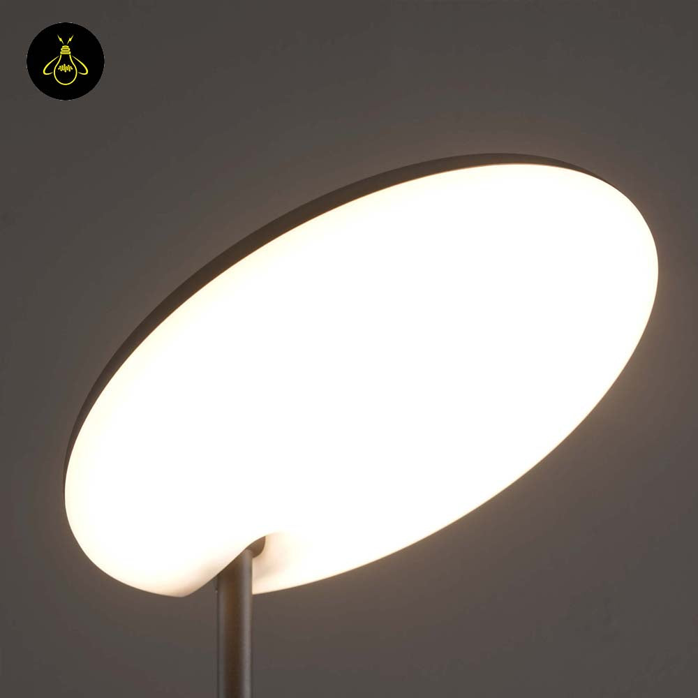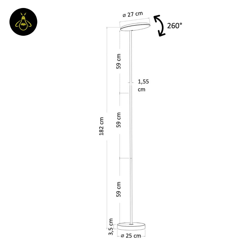 This black LED floor lamp with adjustable head uses an integrated LED system, not a replaceable bulb holder. The approved competitor source supports warm white 3000K output, built-in dimming, a rotating head, indoor-only use, and a cable-mounted control switch. The competitor page also confirms a product weight just under 5 kg, which matches the visual stability of the round base.