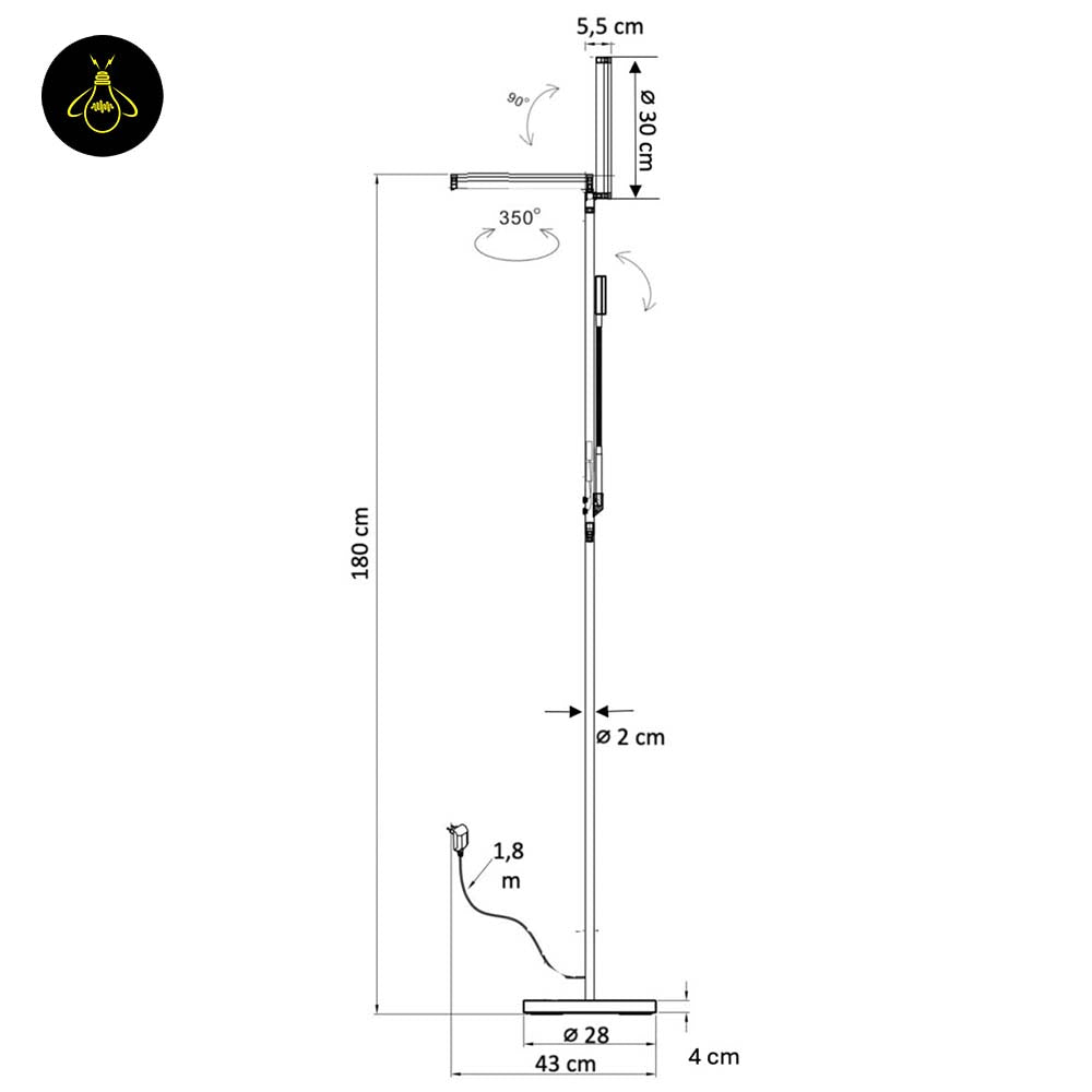 These specifications support the visual reading of the lamp as a tall ambient floor light with a practical secondary reading head, rather than a simple single-source lamp.