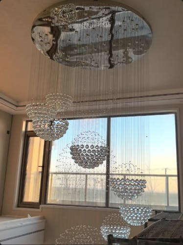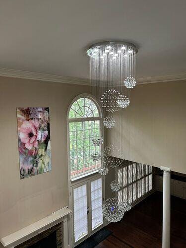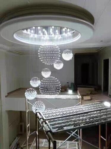 This Staircase Long Crystal Chandelier features multiple tiers of crystal spheres, creating a cascading or waterfall effect. Each tier consists of numerous small, faceted crystals that form spherical clusters. These crystals catch and reflect light, creating a dazzling and sparkling effect. The chrome finish on the metal components adds to the modern and glamorous aesthetic. The arrangement of the light sources within the spheres suggests that the chandelier provides primarily down lighting, illuminating the space below. The overall effect is a soft, ambient glow created by the interplay of light and crystals. The clean lines, geometric shapes, and use of reflective materials contribute to a contemporary or modern style.